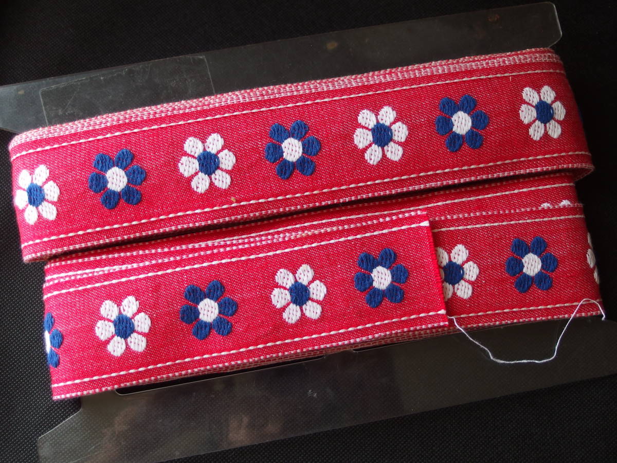 - SALE!スイス ヴィンテージ&レトロ (昭和レトロ) チロル/チロリアンテープ/トリム/ガロン 幅5cm 長1M (赤いデニム生地に紺と白の花柄)