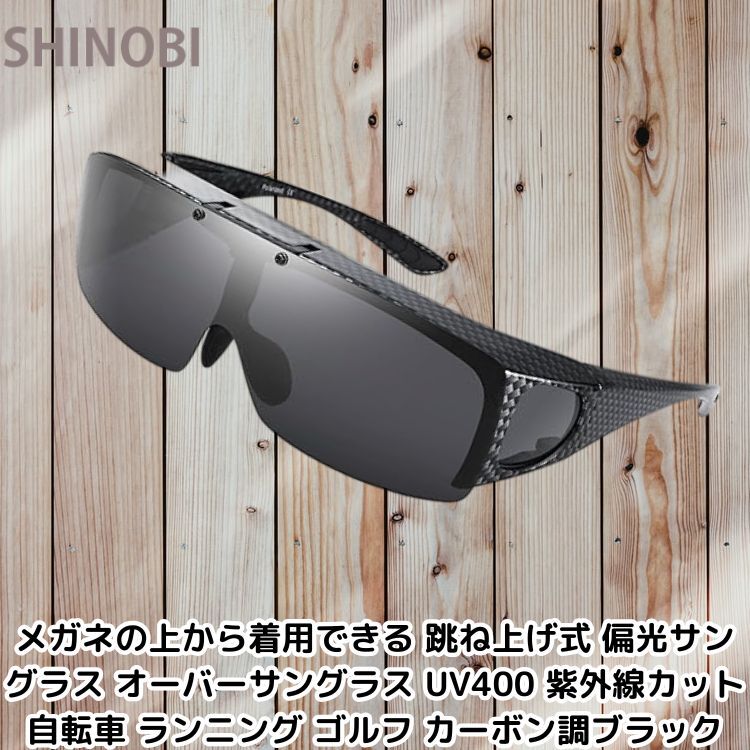 > メガネの上から着用できる 跳ね上げ式 偏光サングラス オーバーサングラス UV400 紫外線カット 自転車 ランニング ゴルフ カーボン調