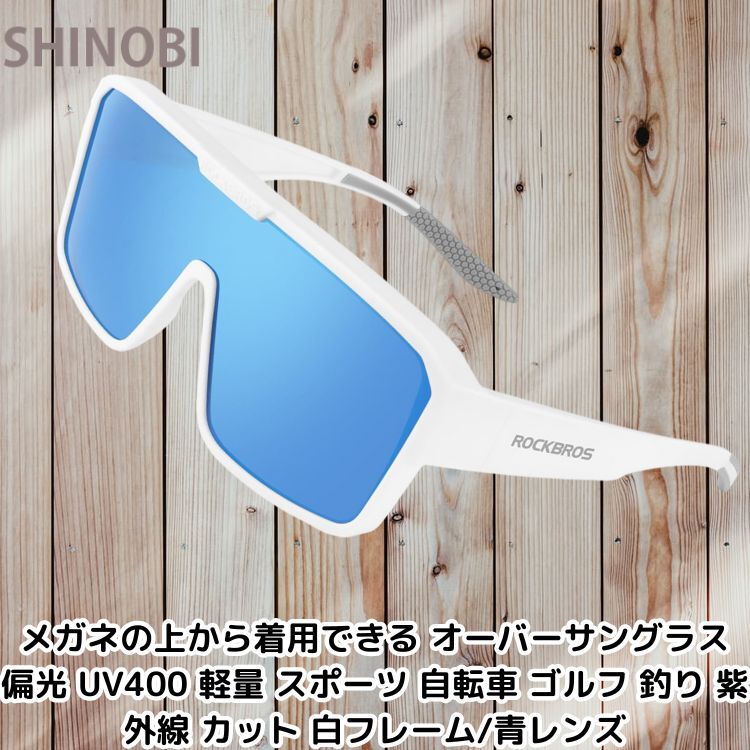 - メガネの上から着用できる オーバーサングラス 偏光 UV400 軽量 スポーツ 自転車 ゴルフ 釣り 紫外線 カット 白フレーム/青レンズ