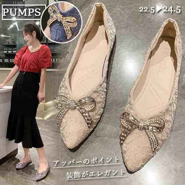 - レディース パンプス フラットヒール 歩きやすい リボン バックル ソフト 高級感 38 ブルー