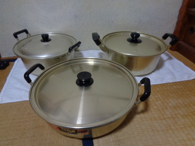 - 厨房用品 アルミ両手鍋 色々3点 まとめて/煮物鍋・煮鍋/ツルマル印30cm(5.6L)&メーカー不詳品26cm&ニギリ矢印エビス鍋24cm/