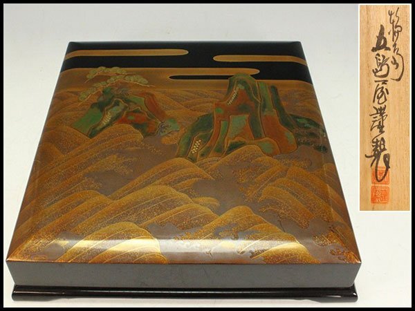- 【金閣】輪島塗 波夫婦岩蒔絵 蓋物 五島屋製 共箱 未使用 旧家蔵出 送料無料(A933)