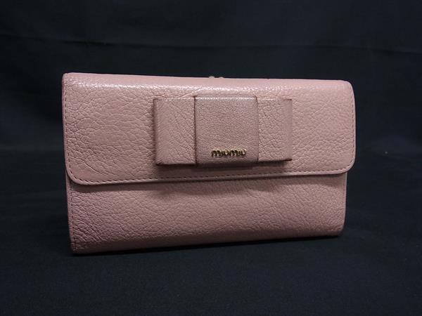 - 1円 miumiu ミュウミュウ レザー リボン がま口 三つ折り 財布 ウォレット 小銭入れ 札入れ レディース ピンク系 FT2562