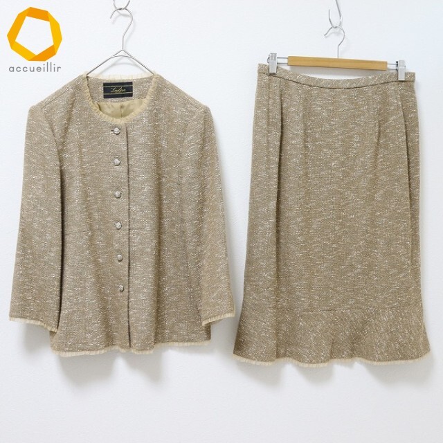 - レリアン Leilian セットアップ スカートスーツ イタリア製生地 ノーカラー ジャケット ロング スカート 銀ボタン 大きいサイズ [a977032n]