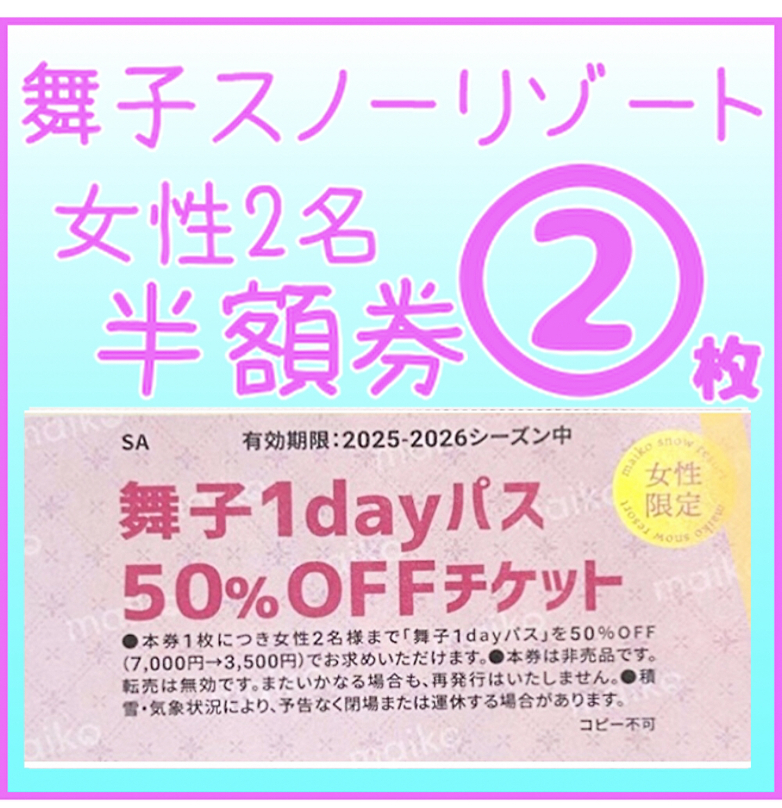 - 舞子スノーリゾート リフト1日券 女性2名 半額割引券 舞子リフト券半額券 2枚 舞子高原スキー場 舞子スキー場