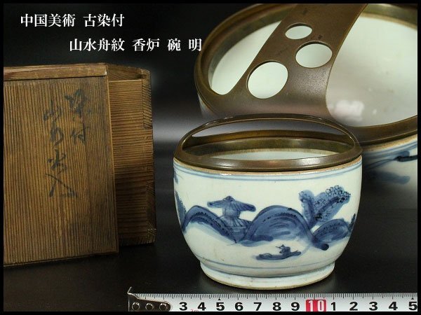 - 【金閣】中国美術 古染付 山水舟紋 香炉 碗 明 旧家蔵出 送料無料(YC233)