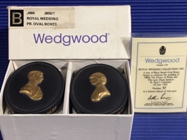 - ◎ウェッジウッド 金/ブラックジャスパー 限定500 「ロイヤルウェディングコレクション」1981 小型蓋物2個セット◎e16元箱・証明書付
