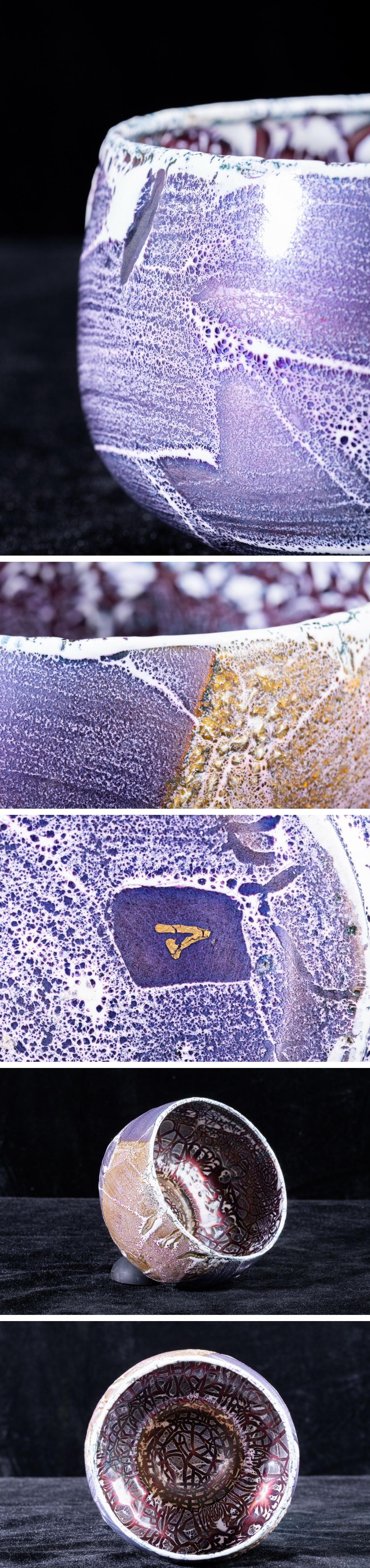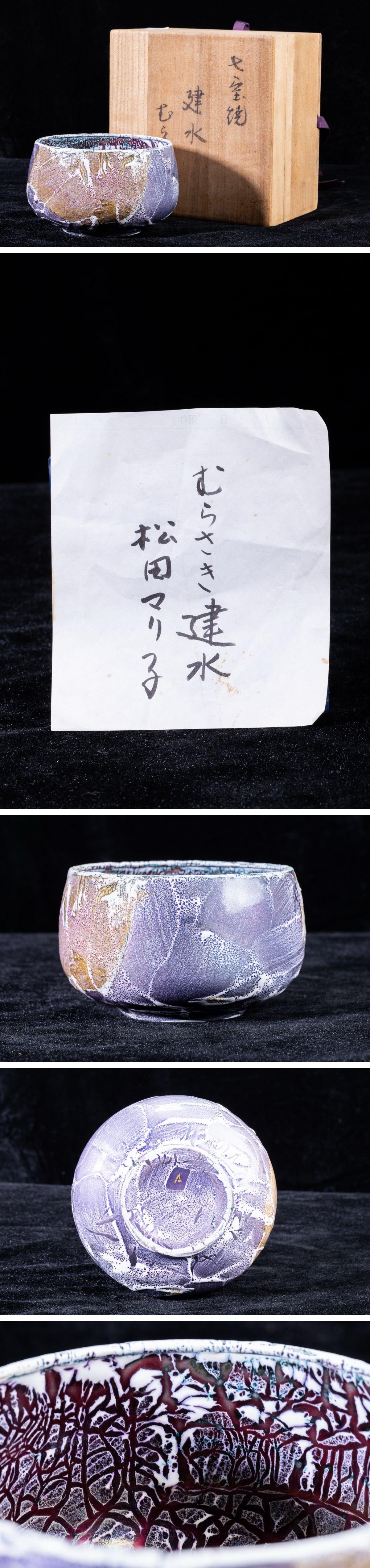 > 【珍品堂】1円から N58-V4 七宝焼 むらさき建水 松田マリ子 作 在銘 細密細工 茶碗 重431g 共箱 木箱 茶道具 時代物 工芸品 骨董品 古美術