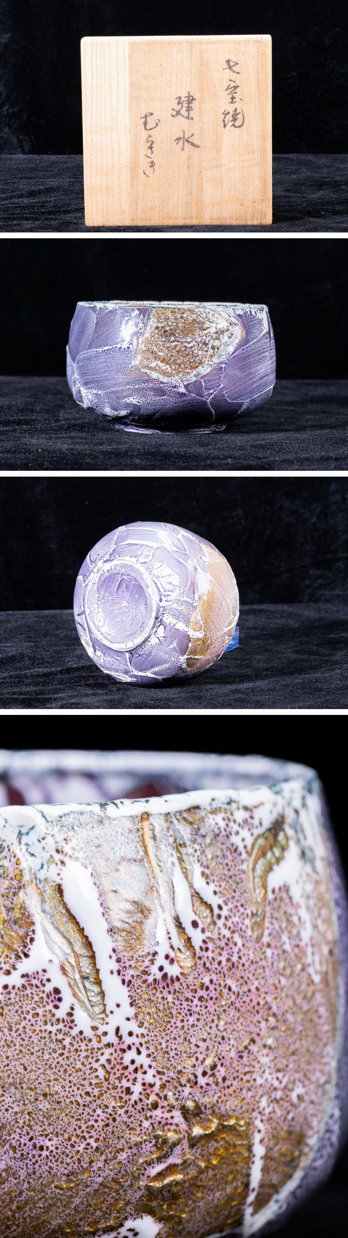 - 【珍品堂】1円から N58-V4 七宝焼 むらさき建水 松田マリ子 作 在銘 細密細工 茶碗 重431g 共箱 木箱 茶道具 時代物 工芸品 骨董品 古美術