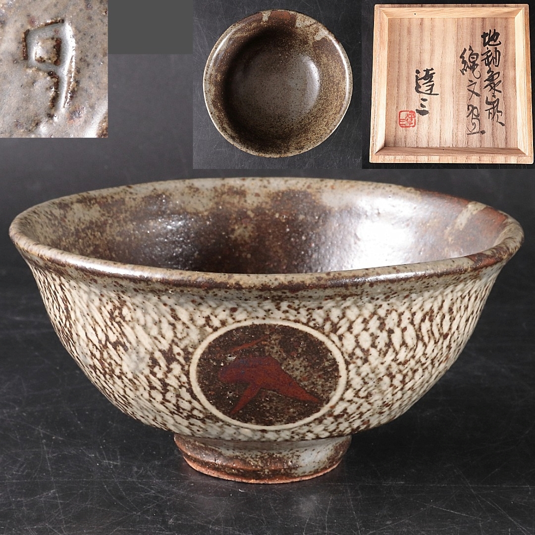 - ◆◇人間国宝 島岡達三 地釉象嵌縄文碗 茶碗 茶道具 益子焼◇◆
