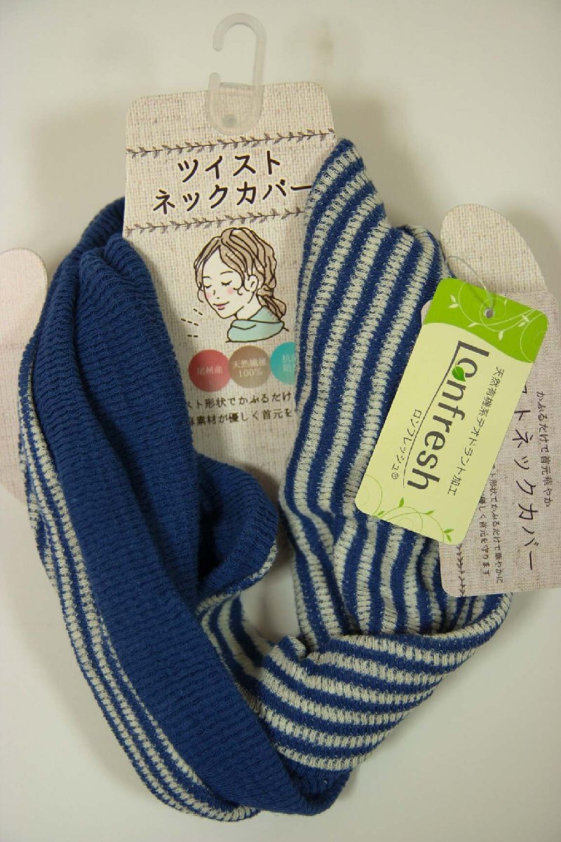 - 送料無料◆抗菌・防臭◆綿&麻素材◆天然有機系デオドラント加工◆日本製(尾州産)◆涼し気な首元◆ツイストネックカバー(ブルーボーダー)