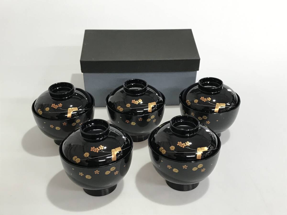- HG8996 汁椀 蓋付椀 5客揃 黒 花結 漆器 お椀 和食器 木乾 伝統工芸品 紙箱