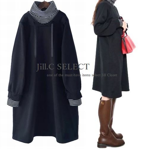 > 新品【送料185円】伸縮◎レイヤード風 あたたかい裏薄起毛 ストレッチ素材*スタイルカバー*プルオーバー*チュニック*ワンピース7743BLACK