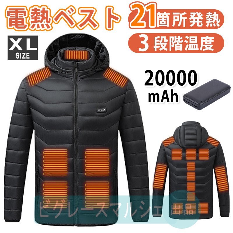 - 電熱ベスト 加熱/ヒーターベスト 21箇所発熱 20000mAhバッテリー付き 5秒速暖 USB給電 急速発熱 3段階調温 ブラック SIZE:XL hw1151