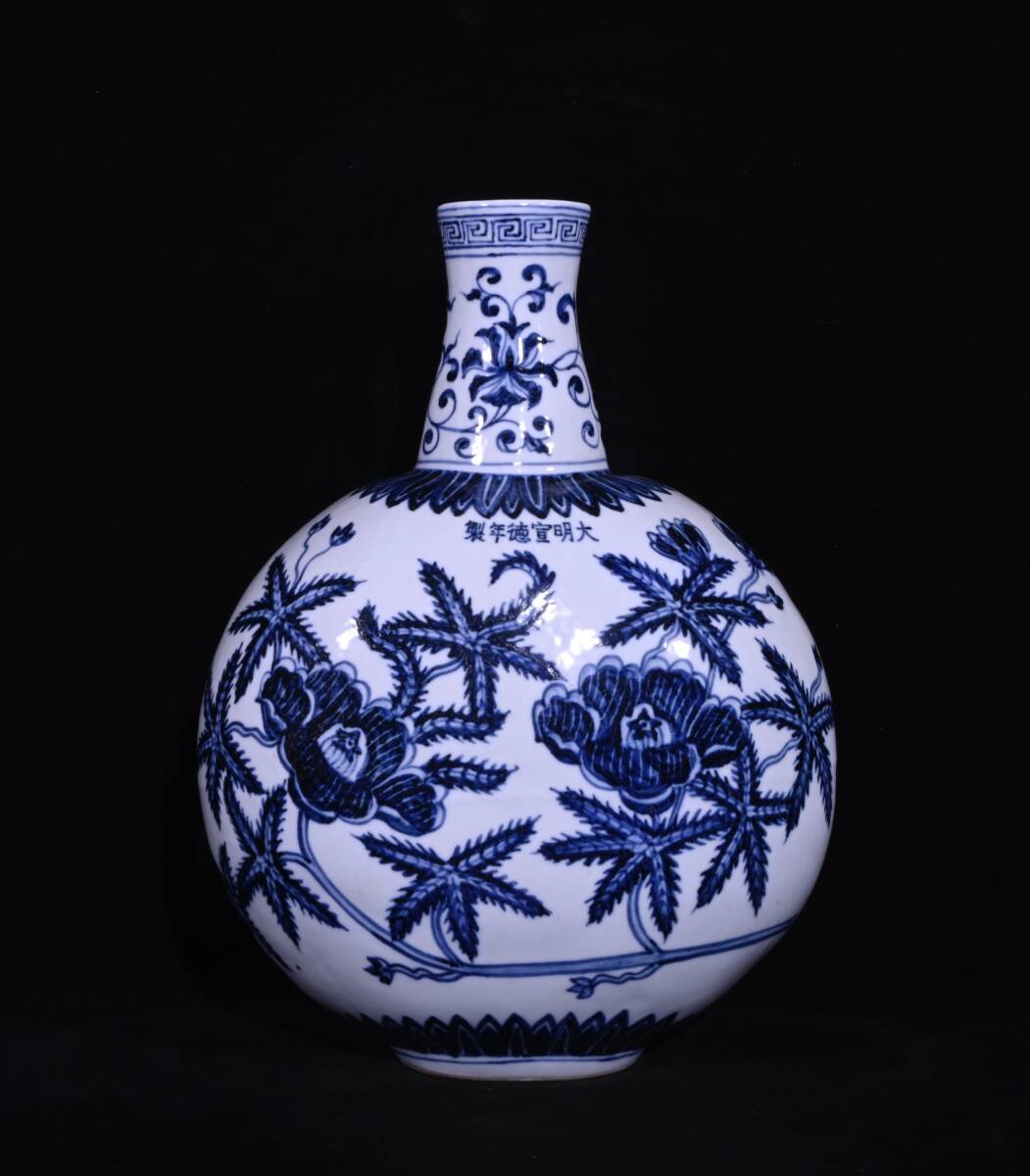> 旧蔵 明代 宣德 青花 秋葵紋 扁瓶 古陶瓷品 陶藝 古擺件 古置物 中国古玩 骨董品 時代物 稀少唐物