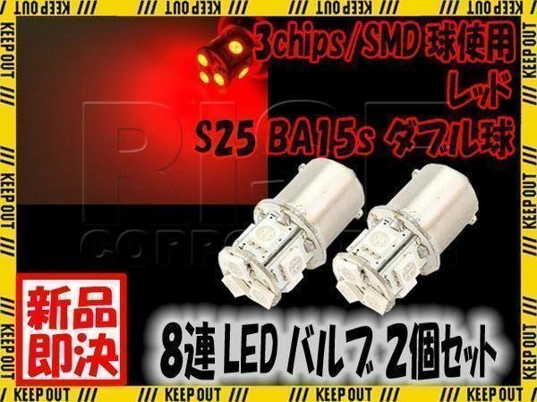 > S25・G18 BAY15d SMD 3チップ LED バルブ ダブル球 ライト 8連 レッド 発光 2個 ストップ テール ブレーキ バック リアフォグ マーカー