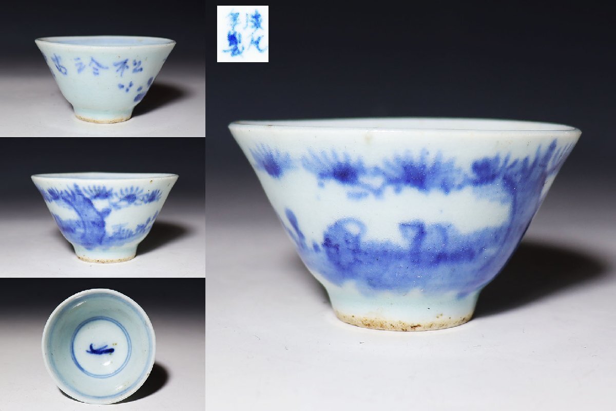 - 【桃】酒器ぐい呑み:清朝期染付松下人物図盃 成化年製