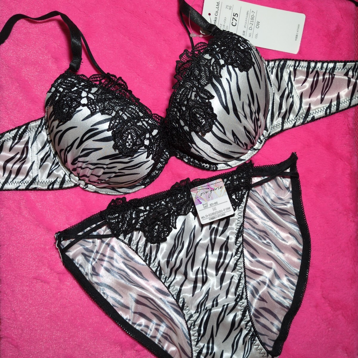 > C75☆M Sexy ブラ☆クロスストリングパンティ サテンのような光沢ツルツルした薄い素材 連なるお花モチーフ