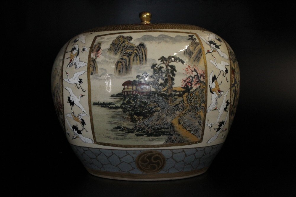 > 【江】薩摩焼 金襴手 鶴群窓抜風景文壺 直径34㎝×高さ31.5㎝ 古美術品(玉龍山花瓶花入花生飾壺)XZ263 JTPBdkii JTDBvvxj