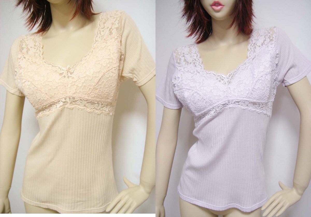 > 送料無料◆超お得2色×2組◆綿100%◆さらっと快適◆針抜き編み◆伸縮性抜群◆ソフトカップ付らくらく3分袖インナー(LL/ベージュ&パープル)