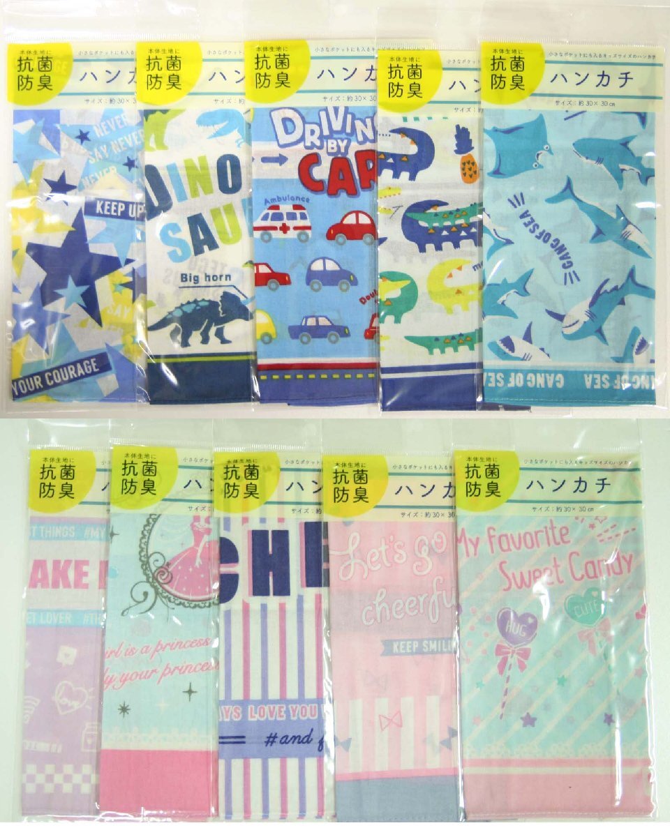 > 送料無料◆まとめ買い20枚◆子供用ハンカチ◆10柄【男の子向け5柄&女の子向け5柄】×2セット◆綿100%◆抗菌・防臭◆個包装◆粗品◆贈答に