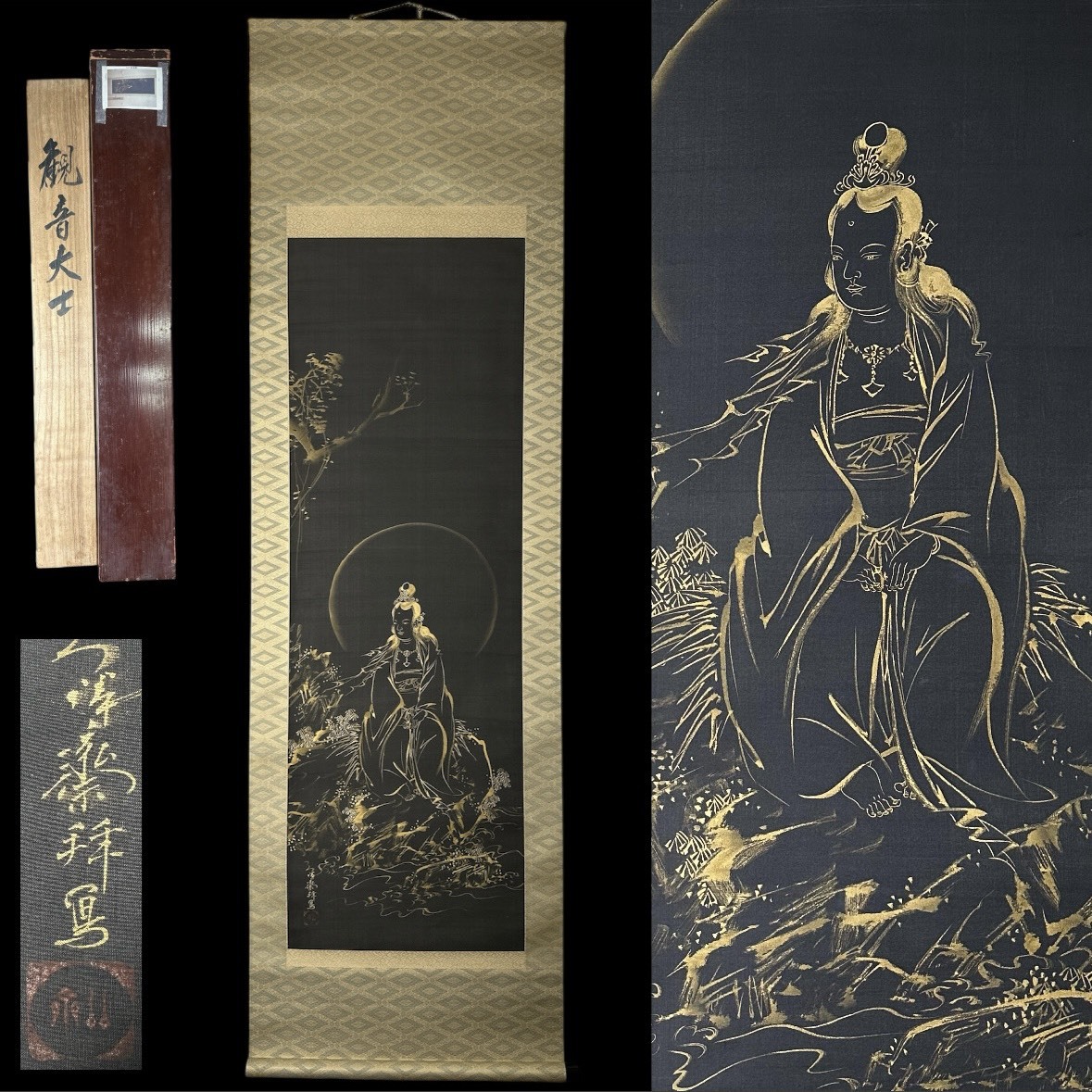- コレクター買取品 仏教美術 掛軸 観音菩薩像 仏画 金彩 仏像 在銘 落款 二重箱 木箱付 絹本 肉筆 時代物 z-54