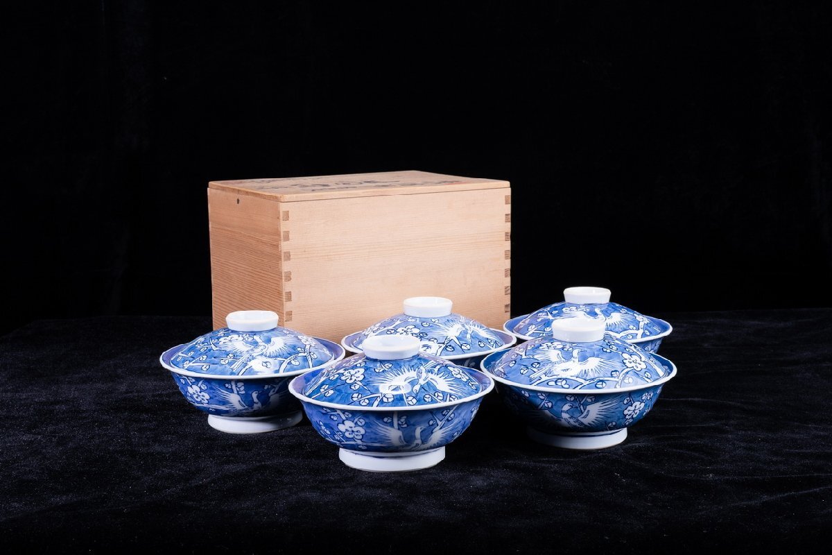 - 【珍品堂】1円から M75-V04 有田焼 館林源右衛門窯 染付 梅鳥紋 蓋向付 5客 蓋茶碗 共箱 木箱 蓋物 名窯 和食器 懐石 骨董品 古美術 時代物