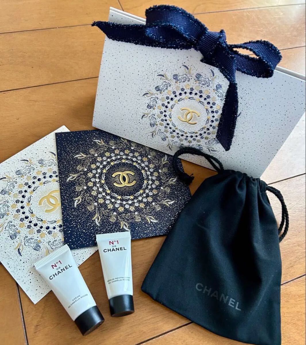- 【プレゼント包装】シャネル サンプルセット 巾着付ポーチき 美容液 クリーム メッセージカード 2025ホリデー 限定