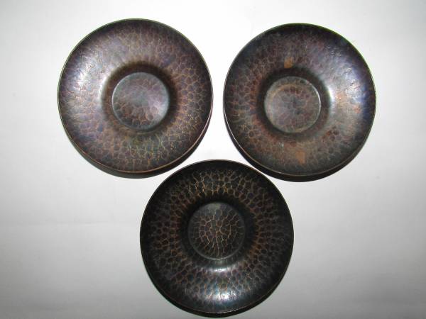 - (旧家・蔵出し)(銘有古い打出し銅製茶托・3客)貴重珍品