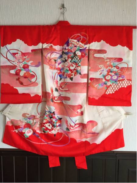 - 【女児の祝い着】身丈95.5cm/長襦袢付き /地模様菱形に扇花籠鶴