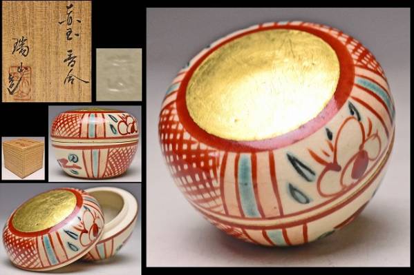 - 加賀瑞山 ★ 萬古焼 ★ 赤玉香合 ★ 共箱 ★ 検 加賀月華 桑名 万古 茶道具 ★