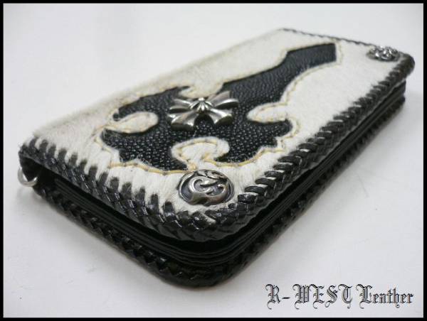 - 牛革×本ハラコ×エイ革スティングレイ黒クロス レザーウォレット白毛/silver925十字架付き