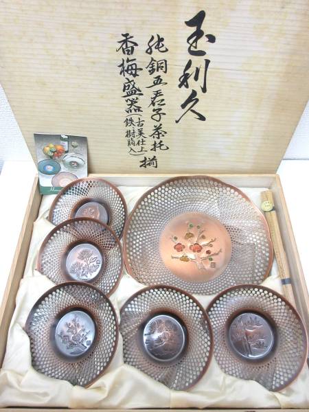 - 未使用品■玉利久 托銅五君子茶托 香梅盛器揃 純銅古美仕上 盛器 茶托 梅・竹・松・菊・水仙 天然竹箸 箱入 管理1702 E-3