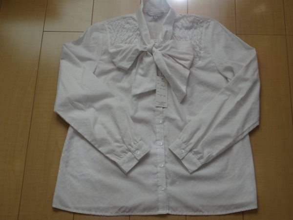 - ⑥新品未使用★白×アイボリー縦縞長袖ブラウス★UV&形態安定