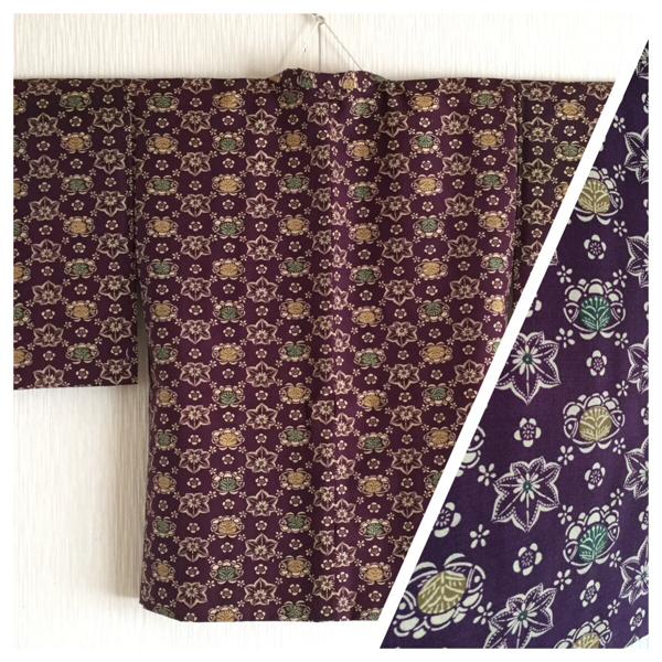 - 【羽織】ウール 袷 羽織丈70cm 紫紺色 花柄 紐付き