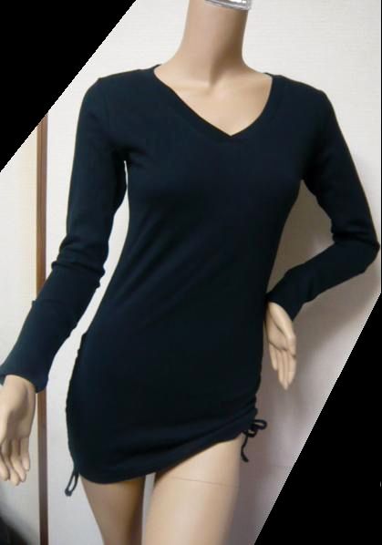 > 匿名配送 送料無料 新品 シンプル シャーリング 長袖 チュニック ワンピース 黒 ブラック レディース M 丈長め ロンT ミニワンピ