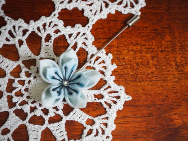 - 【ハンドメイド】手作りアクセサリー★つまみ細工ブローチ★ハットピン水色
