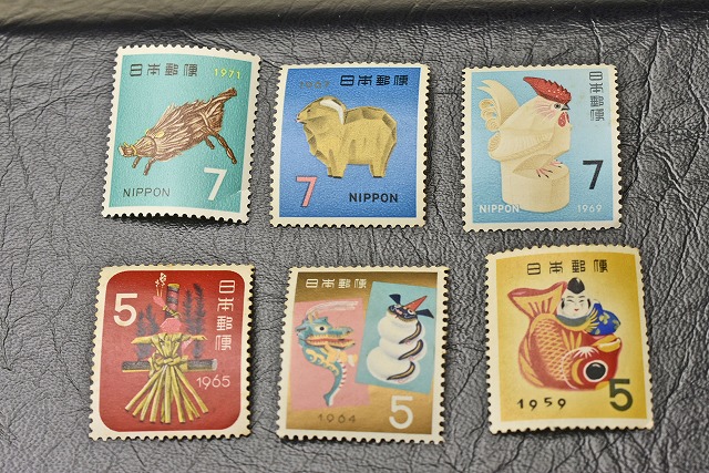 - 【切手】 お年玉切手シリーズ ・1959年 恵比寿土人形 ・1964年 辰 ・1965年 注連縄 ・1967年 羊 ・ 1971年 イノシシ 5円3枚 7円3枚