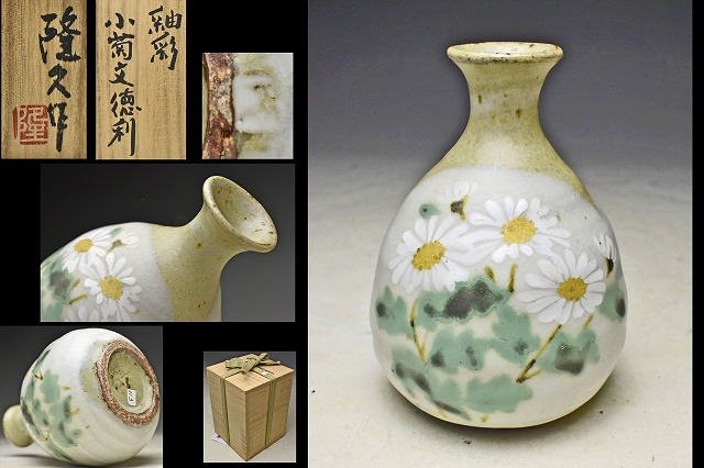 > 古川隆久 ★ 釉彩 小菊文 徳利 ★ 共箱 ★師:人間国宝 藤本能道 ★ 氏らしい絵付が可憐な逸品 ★ 酒器 ★