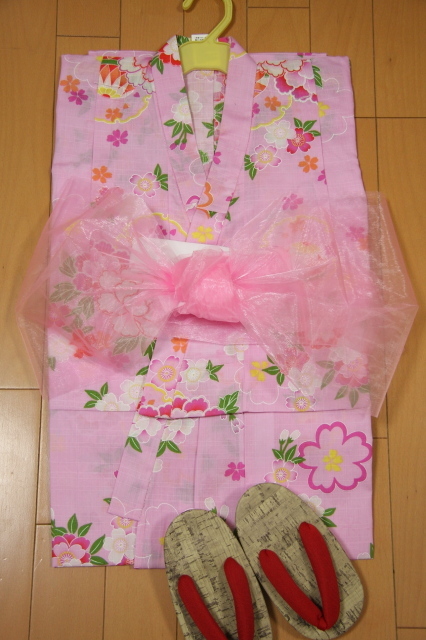 - 新品★子供浴衣3点セット★女の子100cmピンク牡丹雪輪/兵児帯下駄/七夕にも