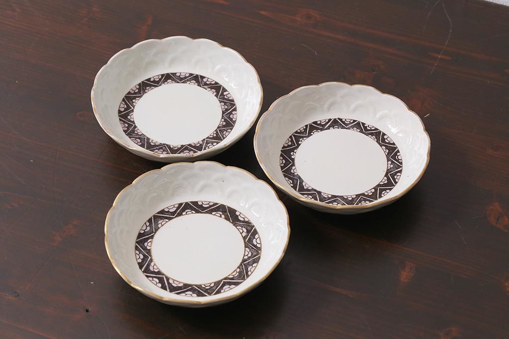 - R-040065 アンティーク雑貨 江戸明治期 白磁陽刻なます皿3枚セット(中皿、和食器)(R-040065)