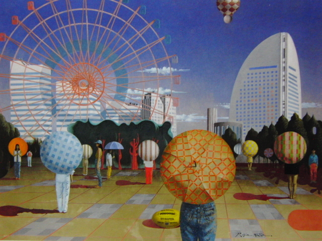 - 松樹路人、郡市空間(パラソルの点在)、希少な額装用画集より、新品高級額装付、状態良好、送料無料、marin