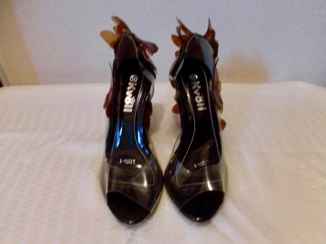 - ●Kvoll /イタリー製/ 茶色の蝶々がいっぱい /クリア チャンキーヒール シューズ/ 35 / 22,5cm