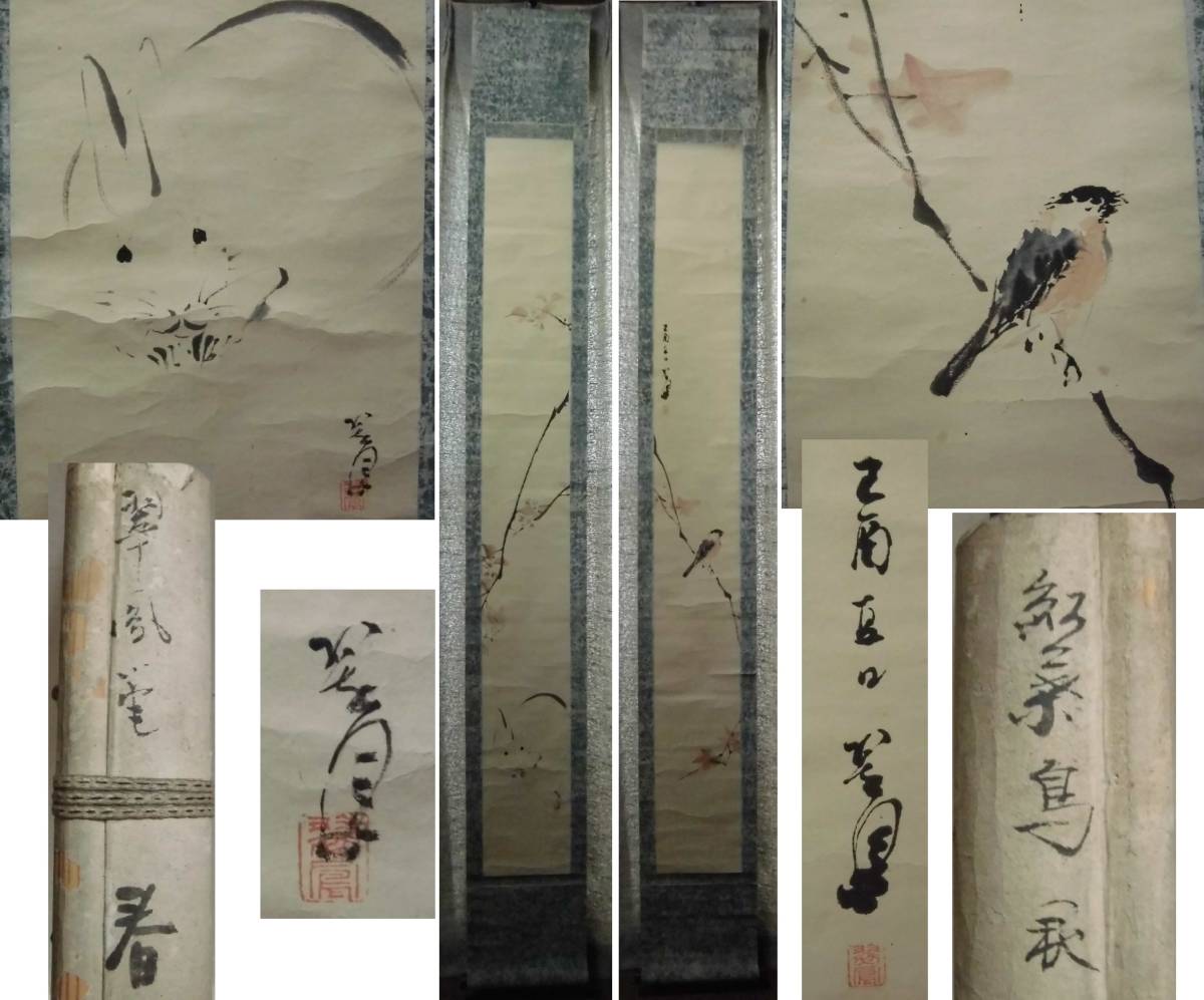 - 古い 掛軸 花鳥画 在銘(落款) 二幅(双幅) 春と秋 紙本 肉筆 軸先木製塗 うさぎと鳥 日本画