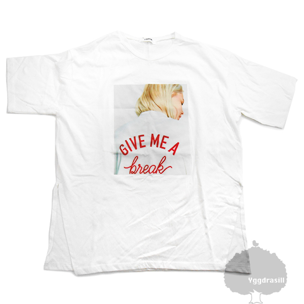 > YGG★韓国製 SYNDROME バックスタイル フォトプリント GIVEMEA Tシャツ 白 ホワイト サイドスリット オーバーサイズ