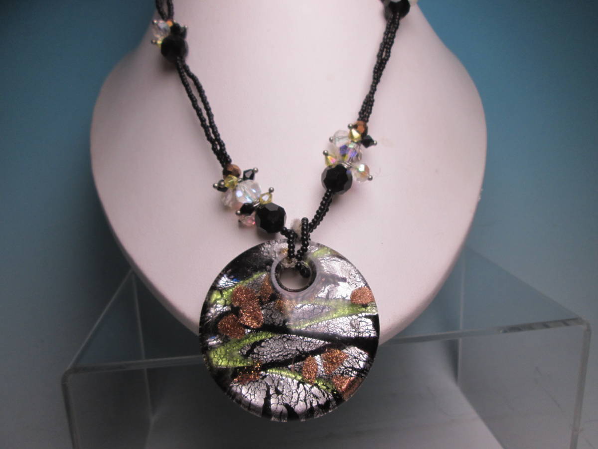 - ☆金銀彩吹き硝子ペンダント付ビーズ&ラインストーンのロングネックレス 54g