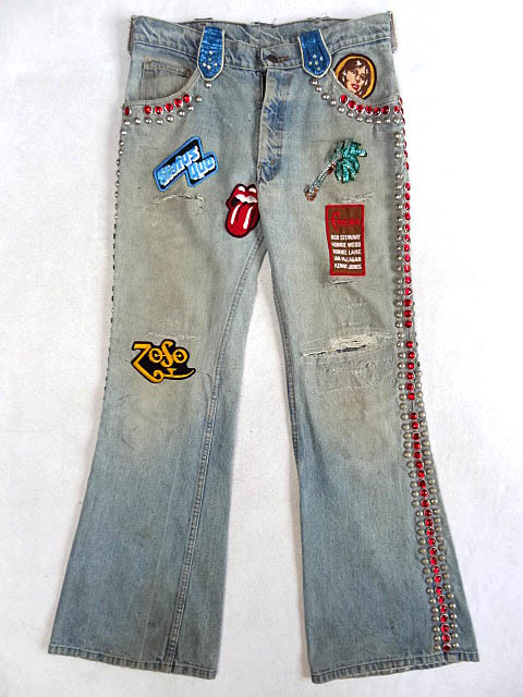 > ビンテージ 希少 究極 スタッズ カスタム FARAH 70S デニム ベルボトム フレア パンツ カラー ストーン 鋲 レア 色落 ワッペン ストーンズ