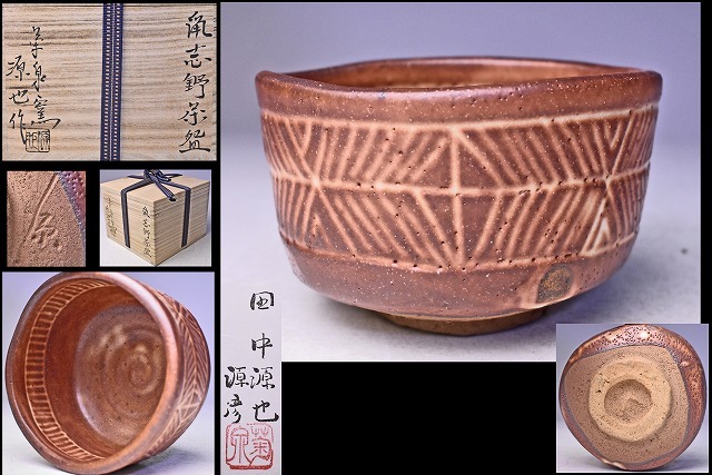 > 田中源也 ★ 鼠志野茶碗 ★ 共箱栞 ★ 緋色の発色 見事 ★ 幾何学文様 ★ 岐阜 土岐 で作陶 ★ 茶道具