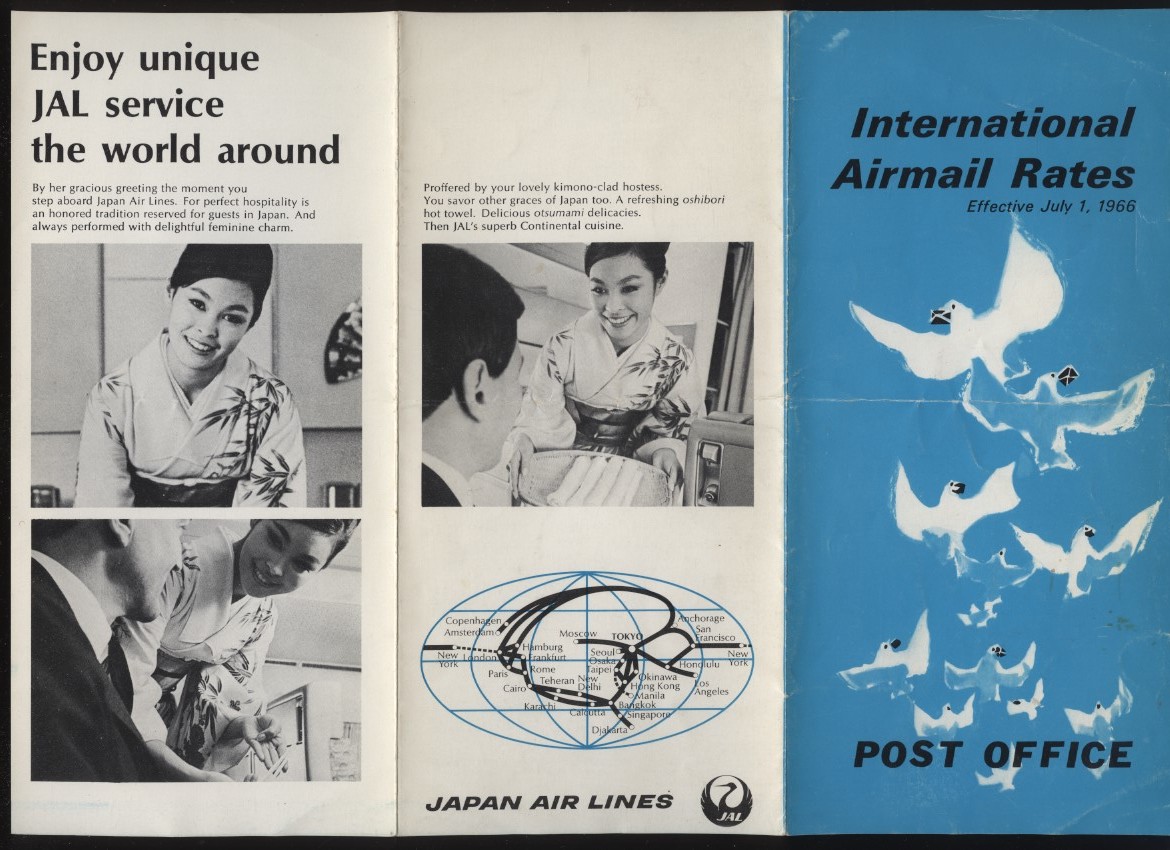 - 日本航空 JAL インターナショナル エアメールレート英文案内パンフ1枚 1966年 :訪日外国人向け郵便物(手紙 ハガキ 荷物)ガイド 郵便局