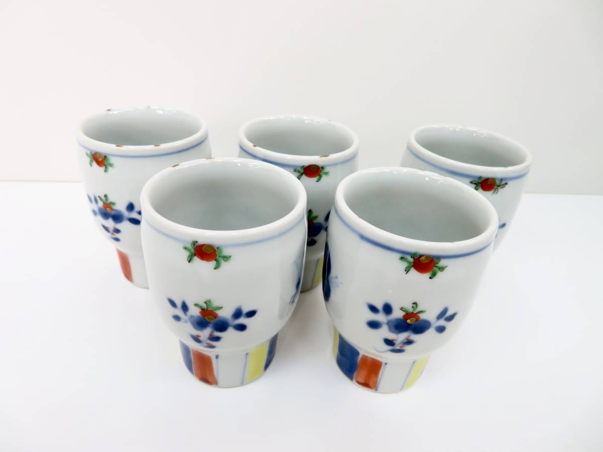- 未使用品 ▲フリーカップ コップ 湯呑み 湯飲み 酒器 銘あり 花 蝶々 5客セット 管理2011 L-10